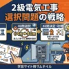 電気理論はNo.1〜8(電気工学等)の選択科目から出題されます。例年3〜5問が電気理論から出題。オームの法則・インピーダンス・力率の計算問題が頻出です。計算が苦手なら「選択問題の戦略」で他の分野を選ぶ手もあります。全体の攻略は「第一次検定の出題傾向と攻略法」をご覧ください。