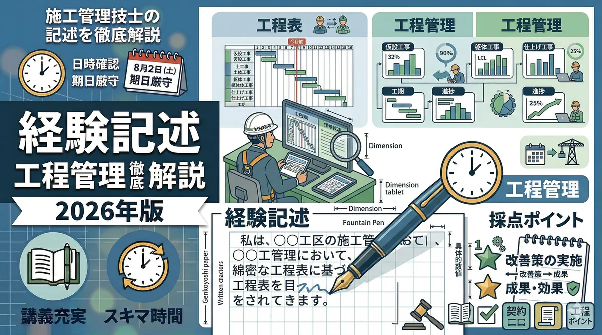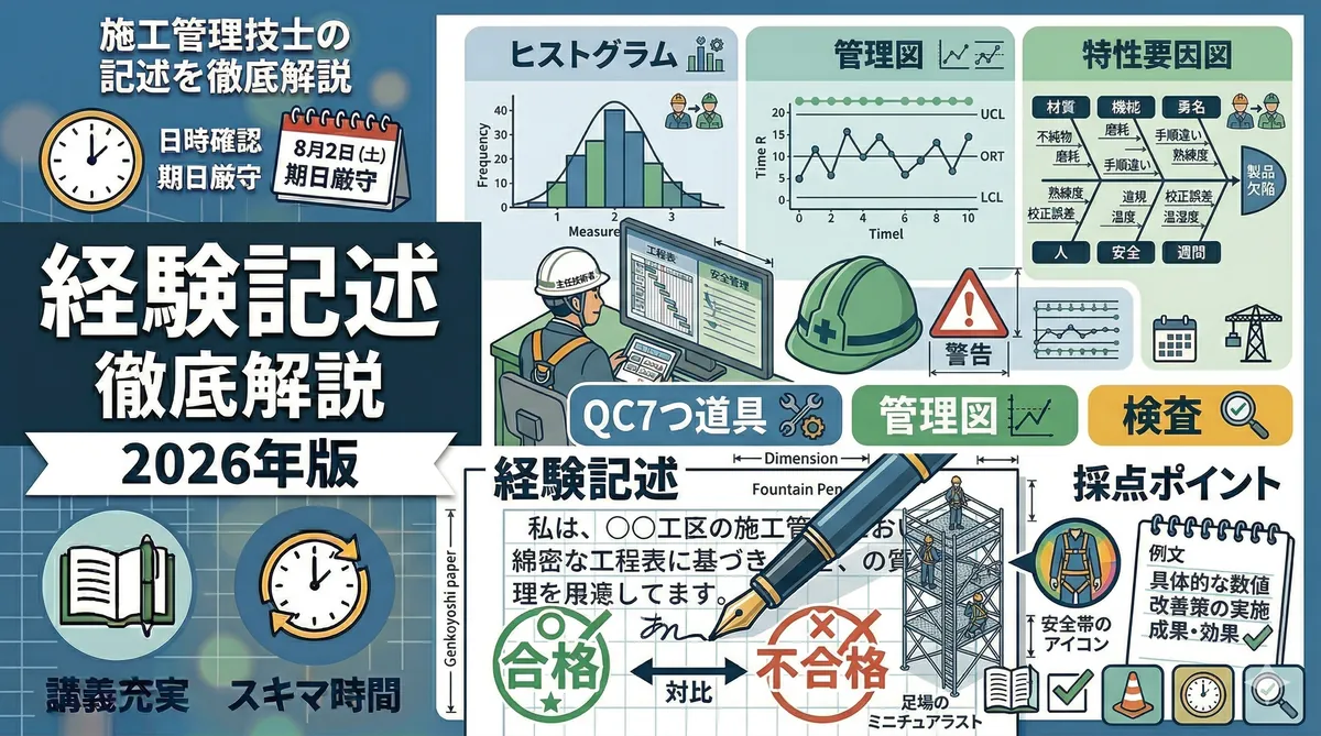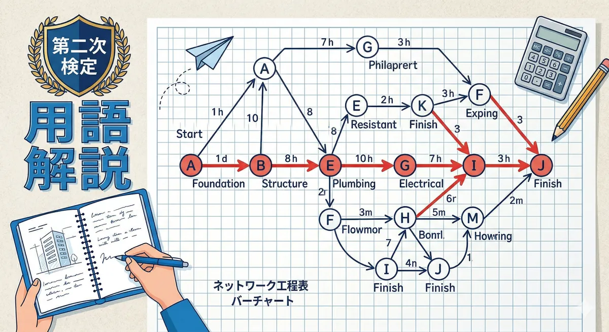 第一次検定の法規はマークシートで「正しいものを選ぶ」形式でしたが、第二次検定では正確な語句を自分で書く必要があります。「建設業法」「建築基準法・労安法」で学んだ知識を正確に記述できるよう練習しましょう。第二次検定の全体像は「第二次検定の出題傾向と攻略法」で確認しておくと効果的です。