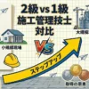 施工管理技士の全体像は「施工管理技士とは?7種類の資格を徹底解説」、2級と1級の違いは「主任技術者 vs 監理技術者」で詳しく解説しています。