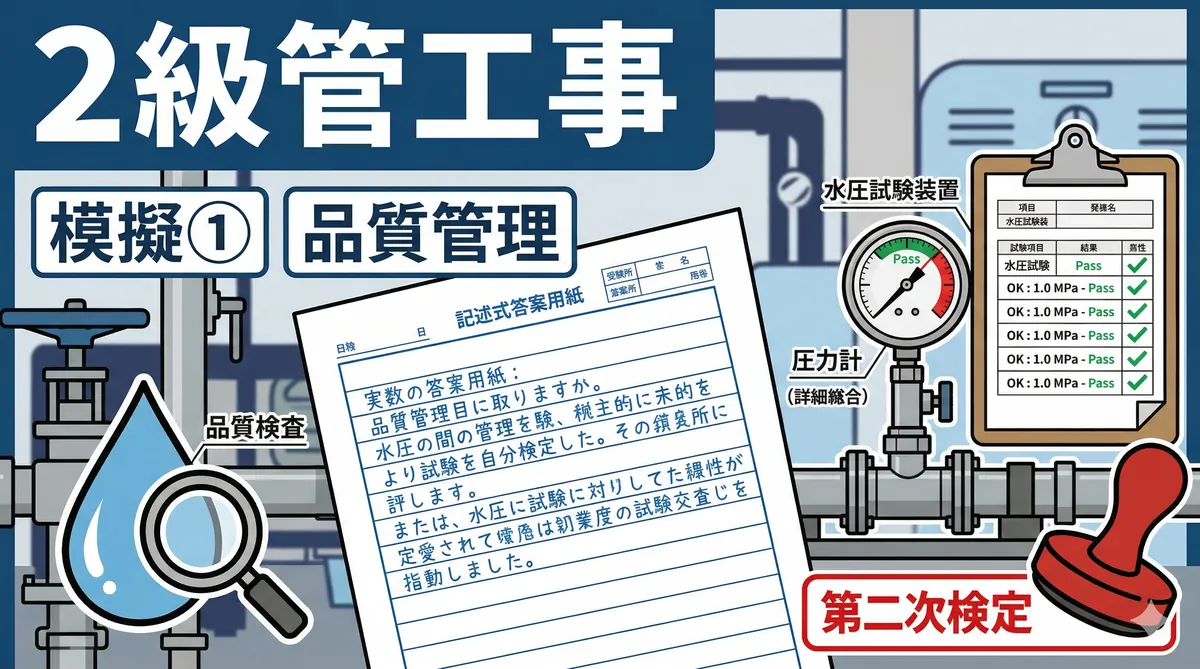 第二次検定の問題4では、仕上げ施工に関する用語の説明と施工上の留意事項を記述する問題が出題されます。防水・タイル・左官・塗装・内装と出題範囲が広いのが特徴です。