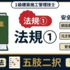 法規②では建築基準法を中心に、建設工事に関連するその他の法規を学びます。1級では防火区画・避難規定や各種届出の要件が問われます。
