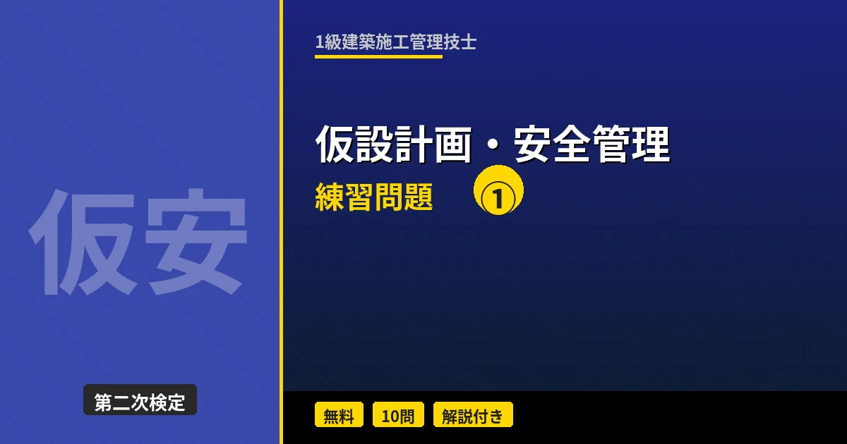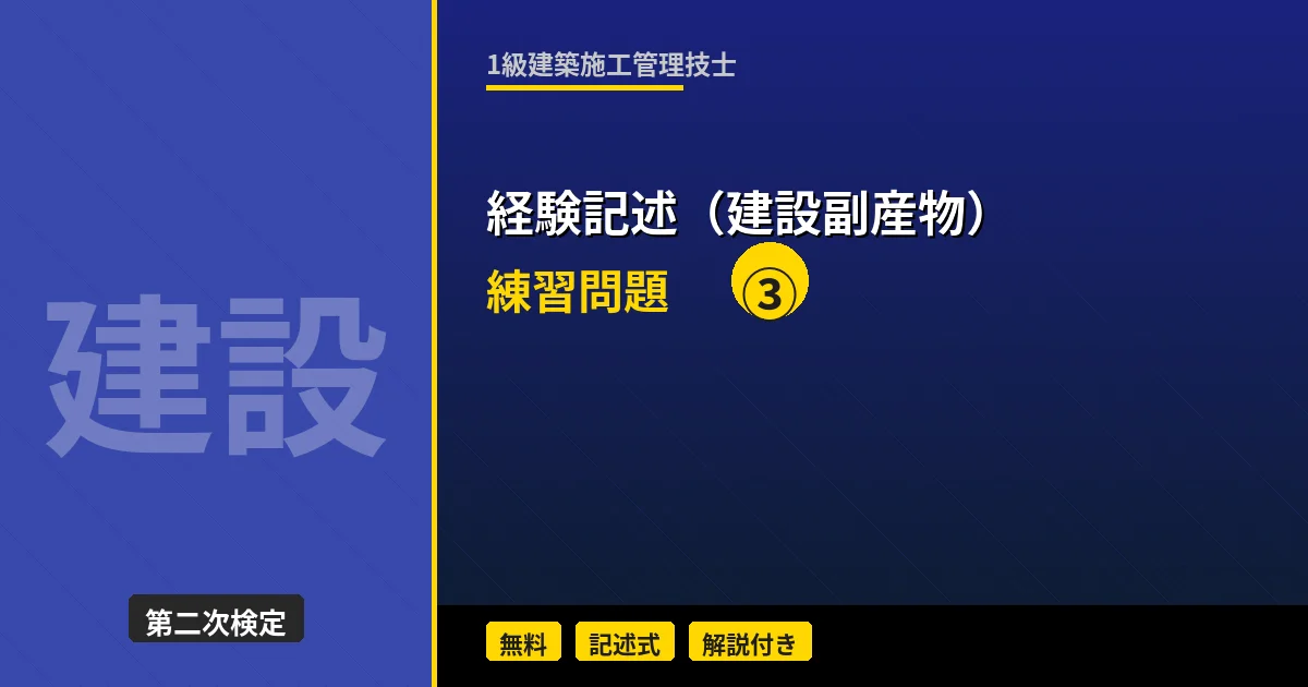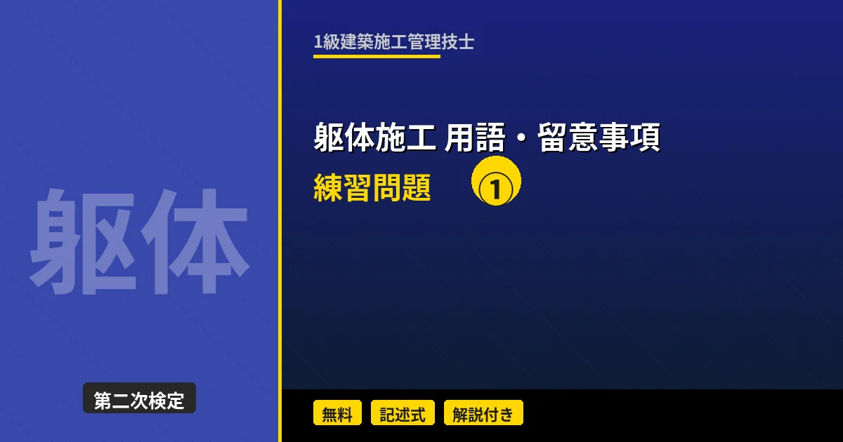1級建築施工管理技士 仕上げ施工 用語・留意事項 ミニテスト 第3回 第3回(総仕上げ)では金属工事・建具工事・ガラス工事の用語を練習します。外壁のカーテンウォールやALC板など1級特有の用語も含まれます。 「仕上げ施工 用語・留意事項」を復習してから挑戦しましょう。 テスト情報 形式:記述式(模範解答付き) 問題数:5用語から3つを選択して記述 テーマ:金属工事・建具工事・ガラス工事 目標時間:30分 【問題】 次の5つの用語から3つを選び、それぞれについて「用語の説明」と「施工上の留意事項」を記述しな ...