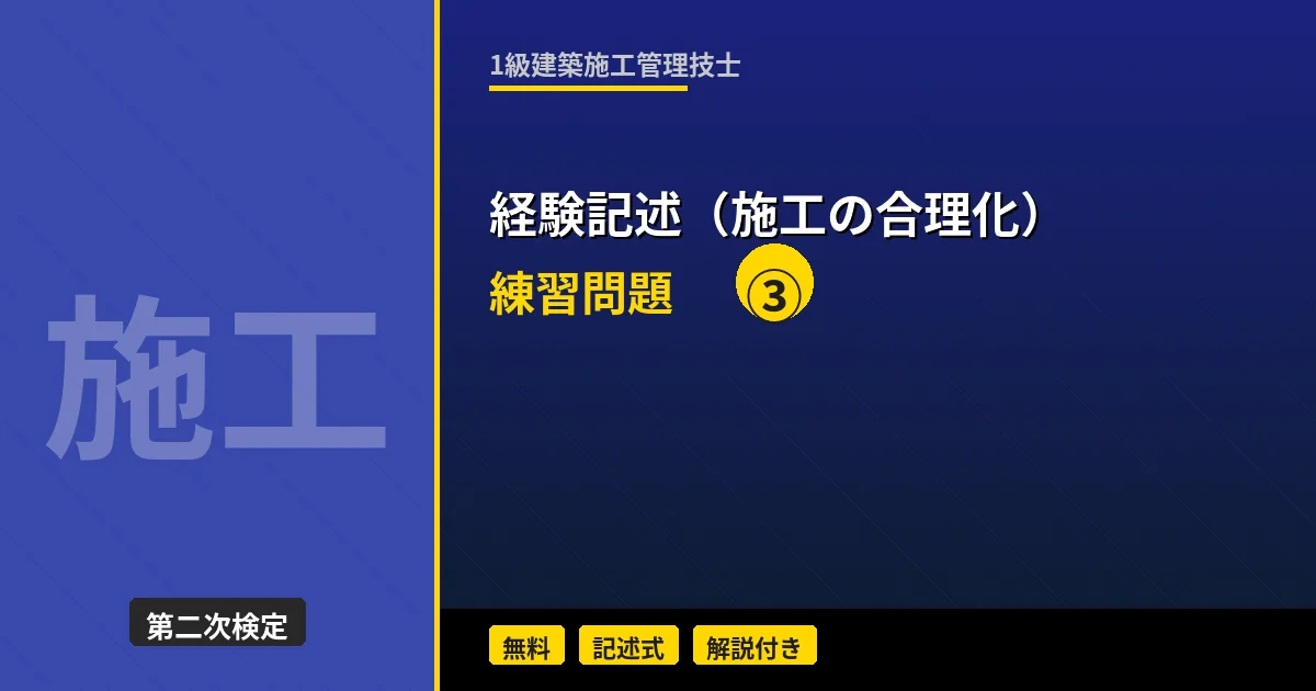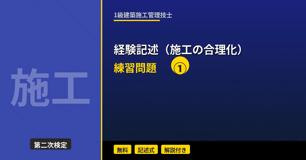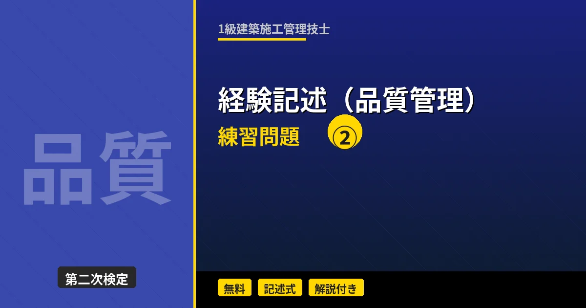 1級建築施工管理技士 経験記述(建設副産物・環境対策)ミニテスト 第2回 第2回ではコンクリートがらの再資源化(Recycle)をテーマに記述練習を行います。解体工事を伴う建替え工事で、特定建設資材廃棄物をどのように再資源化したかを具体的に記述しましょう。 「経験記述の書き方(建設副産物・環境対策)」を復習してから挑戦しましょう。 テスト情報 形式:記述式(模範解答付き) 問題数:3問(工事概要+副産物対策の目的・理由+実施内容・効果) テーマ:コンクリートがらの再資源化(Recycle) 目標時間:40 ...