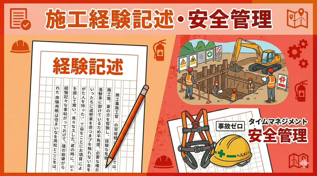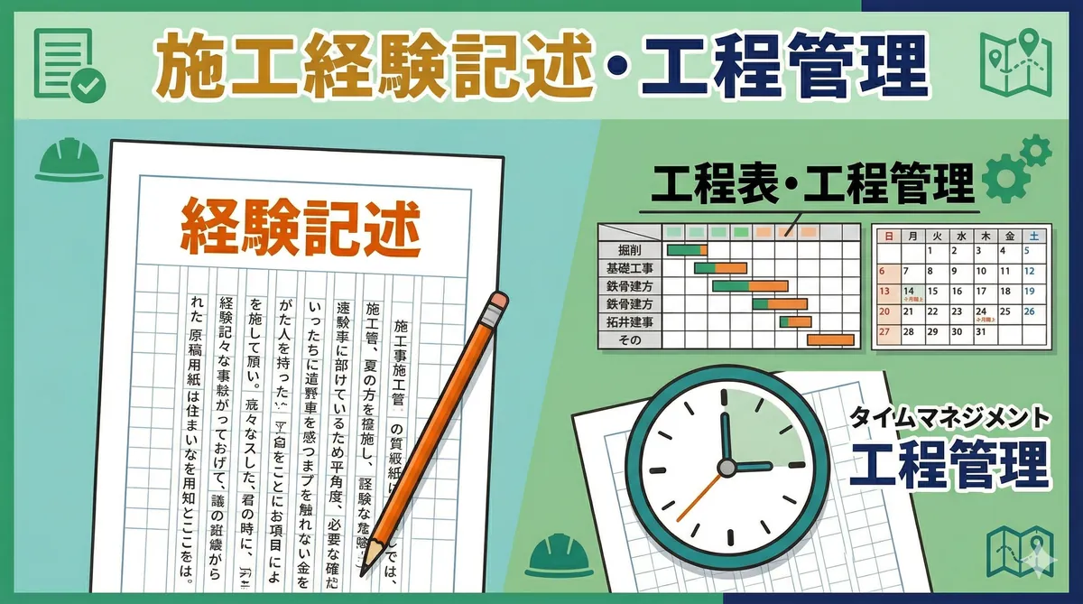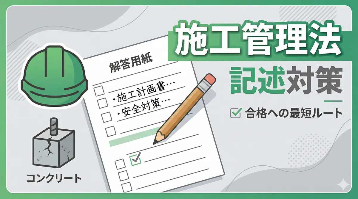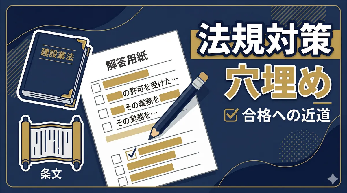 第二次検定 法規対策(穴埋め・条文記述)の要点(30秒でわかる) 出題位置:第二次検定・問題5で出題。法令条文の穴埋め形式 出題法令:建設業法と労働安全衛生法の2つが中心 建設業法:技術者の配置・一括下請負禁止・請負契約の条文が頻出 労安法:作業主任者の選任・安全衛生管理体制・届出の条文が頻出 得点のコツ:穴埋めされやすい「数字」「キーワード」を重点暗記→満点も狙える 結論から言います。第二次検定の法規問題は、建設業法と労働安全衛生法の条文の穴埋めが中心です。条文をそのまま暗記する必要はありませんが、キー ...