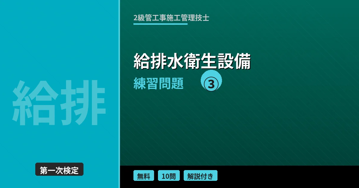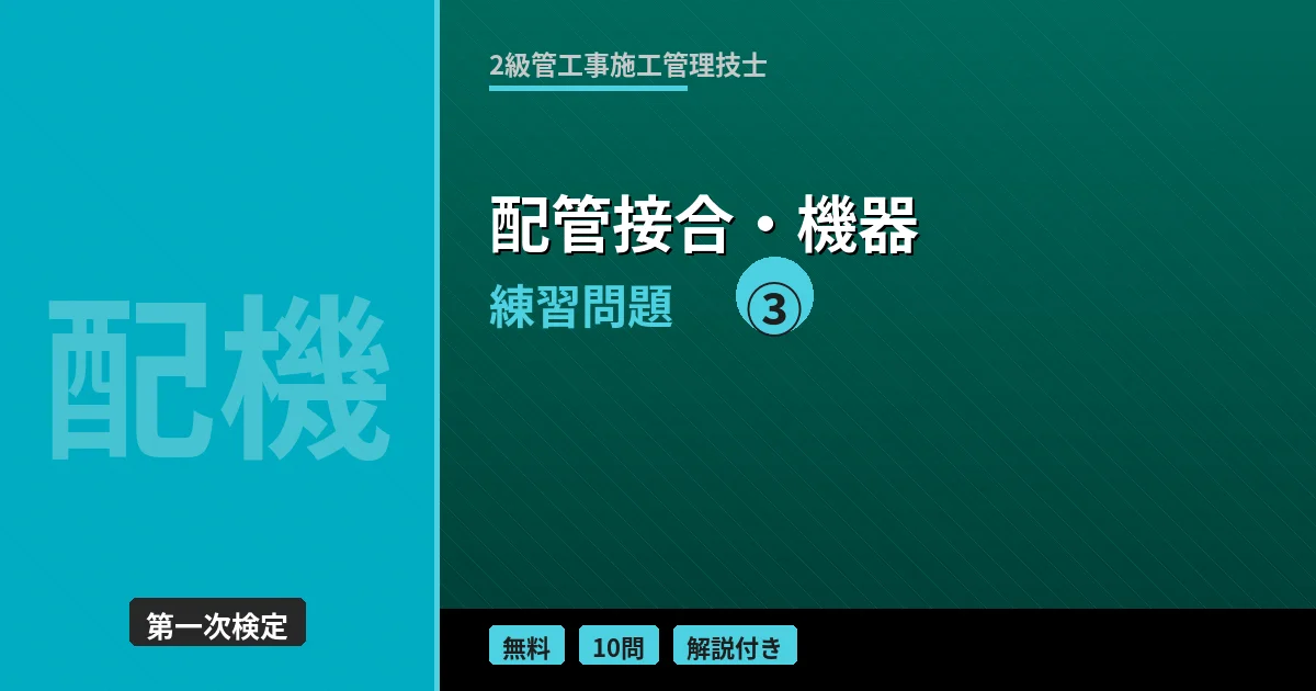 2級管工事施工管理技士 配管の接合・加工/機器・ダクト ミニテスト 第3回 第3回では配管の試験・検査、機器の据付、配管施工の総合問題を出題します。第1・2回の知識を活用した総仕上げです。 「配管の接合・加工をわかりやすく解説」「機器・ダクト・配管付属品をわかりやすく解説」を復習してから挑戦しましょう。 テスト情報 形式:四肢択一(各問1つ選択) 問題数:10問 分野:配管試験・機器据付・総合 目標時間:15分 配管の接合・加工/機器・ダクト ミニテスト(全10問) 問1 配管の水圧試験に関する記述として ...