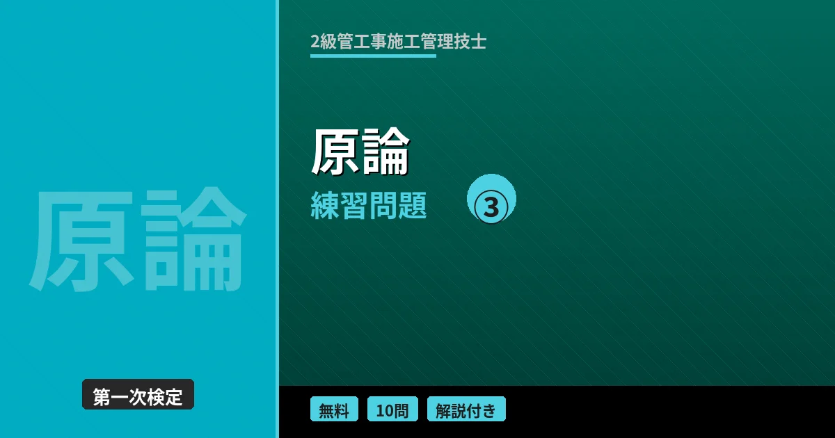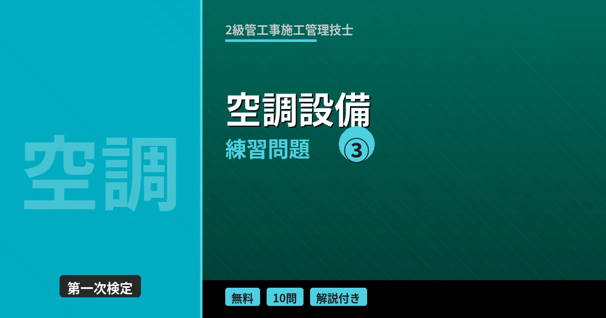 2級管工事施工管理技士 空調設備 ミニテスト 第3回 第3回ではダクトの種類・施工・付属品と空調システムの総合問題を出題します。第1・2回の知識を活用した応用問題も含まれています。 「空調設備①」「空調設備②」を復習してから挑戦しましょう。 テスト情報 形式:四肢択一(各問1つ選択) 問題数:10問 分野:空調設備(ダクト・空調システム総合) 目標時間:15分 空調設備 ミニテスト(全10問) 問1 ダクトの種類に関する記述として、最も不適当なものはどれか。 (1)亜鉛鉄板ダクト(角ダクト)は、空調・換気 ...