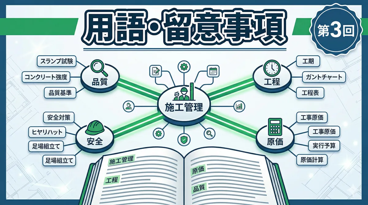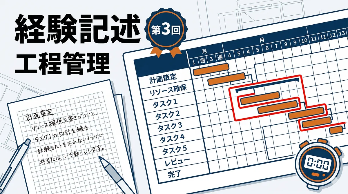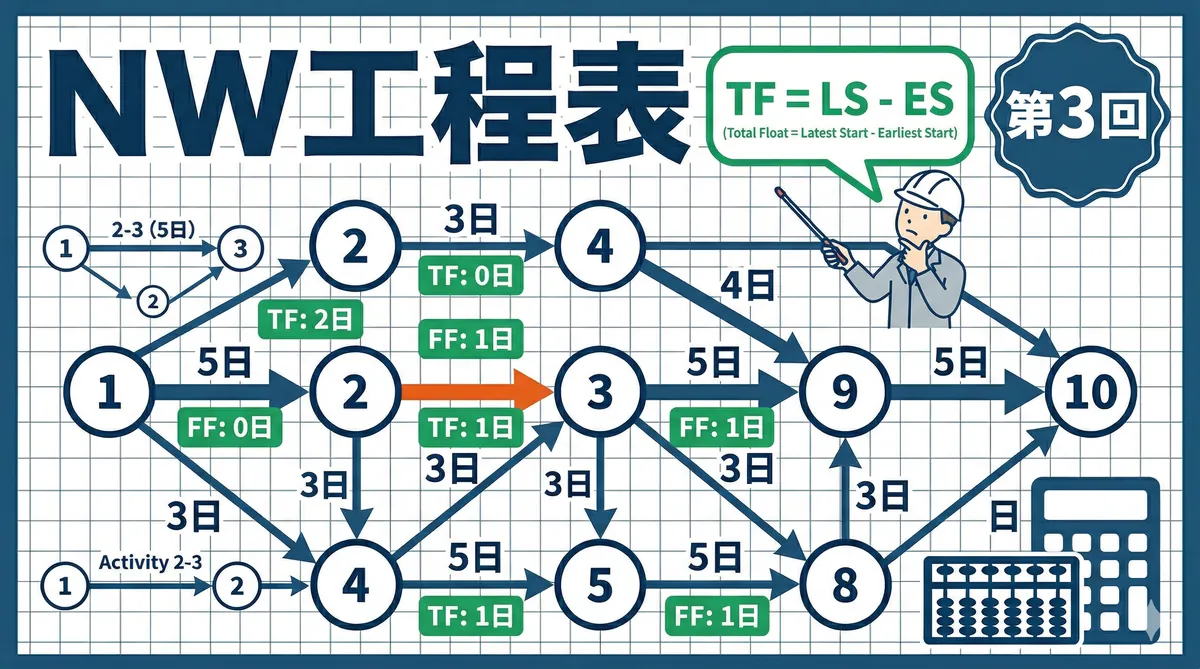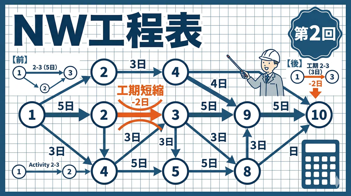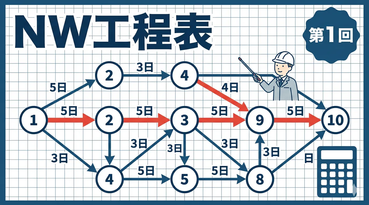 2級土木施工管理技士 ネットワーク工程表・バーチャート ミニテスト 第3回 第二次検定では、ネットワーク工程表やバーチャートに関する計算問題・記述問題が出題されます。第1回(基本計算)・第2回(工期短縮・応用)に続く最終回として、総合的な応用問題を5問出題します。 「ネットワーク工程表・バーチャートの解き方(記述式)」を復習してから挑戦しましょう。 テスト情報 形式:計算問題・記述式(模範解答付き) 問題数:5問 分野:総合応用(ダミー・複数クリティカルパス・出来高曲線) 目標時間:30分 ネットワーク工 ...