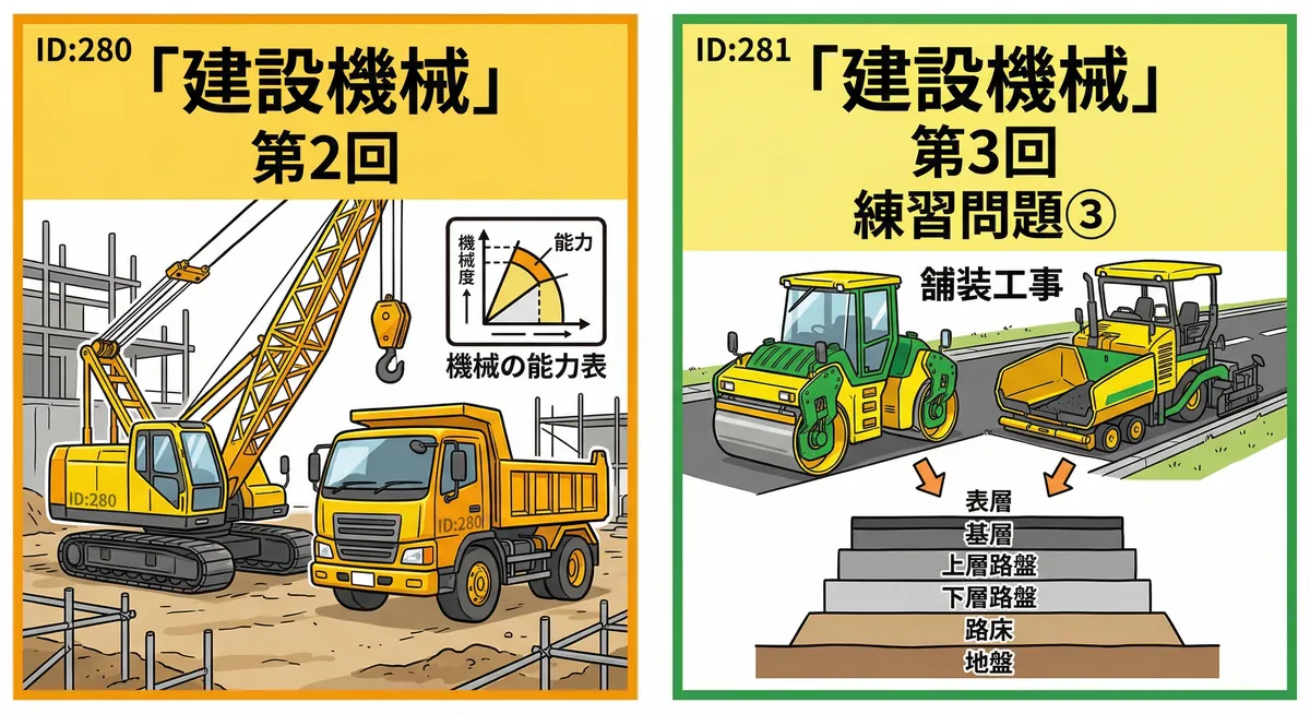 2級土木施工管理技士の第一次検定で出題される「建設機械」分野のミニテスト第2回です。 第1回より一歩踏み込んだ問題を中心に、施工条件に応じた機械選定や安全管理から全10問を出題します。 現場で「どの機械を使うべきか」を判断できる力を身につけましょう! 項目 内容 出題分野 建設機械(掘削・運搬・締固め・クレーン) 問題数 10問(四肢択一) 目安時間 10〜15分 対応検定 第一次検定 問1 締固め機械と適する土質の組合せのうち、適当でないものはどれか。 (1)振動ローラー ――― 砂質土(2)タンピング ...