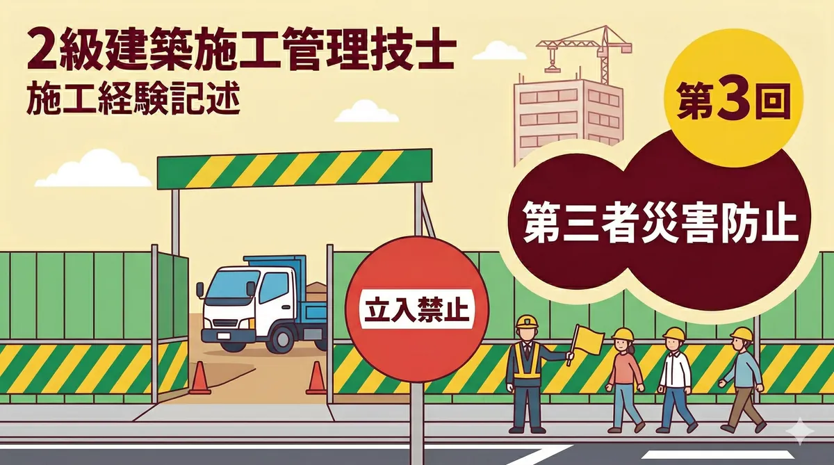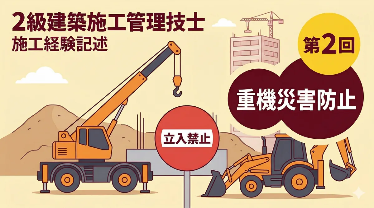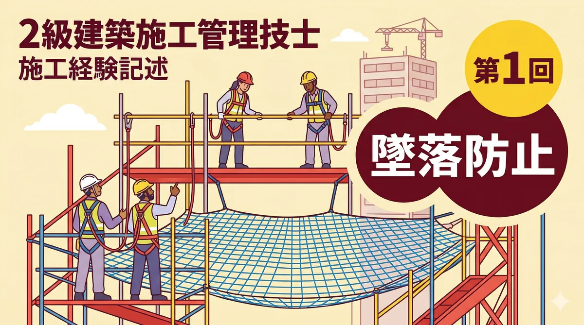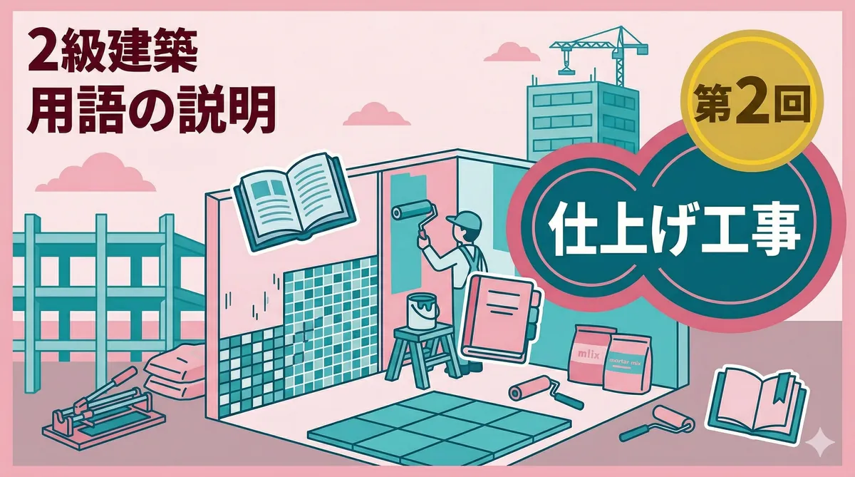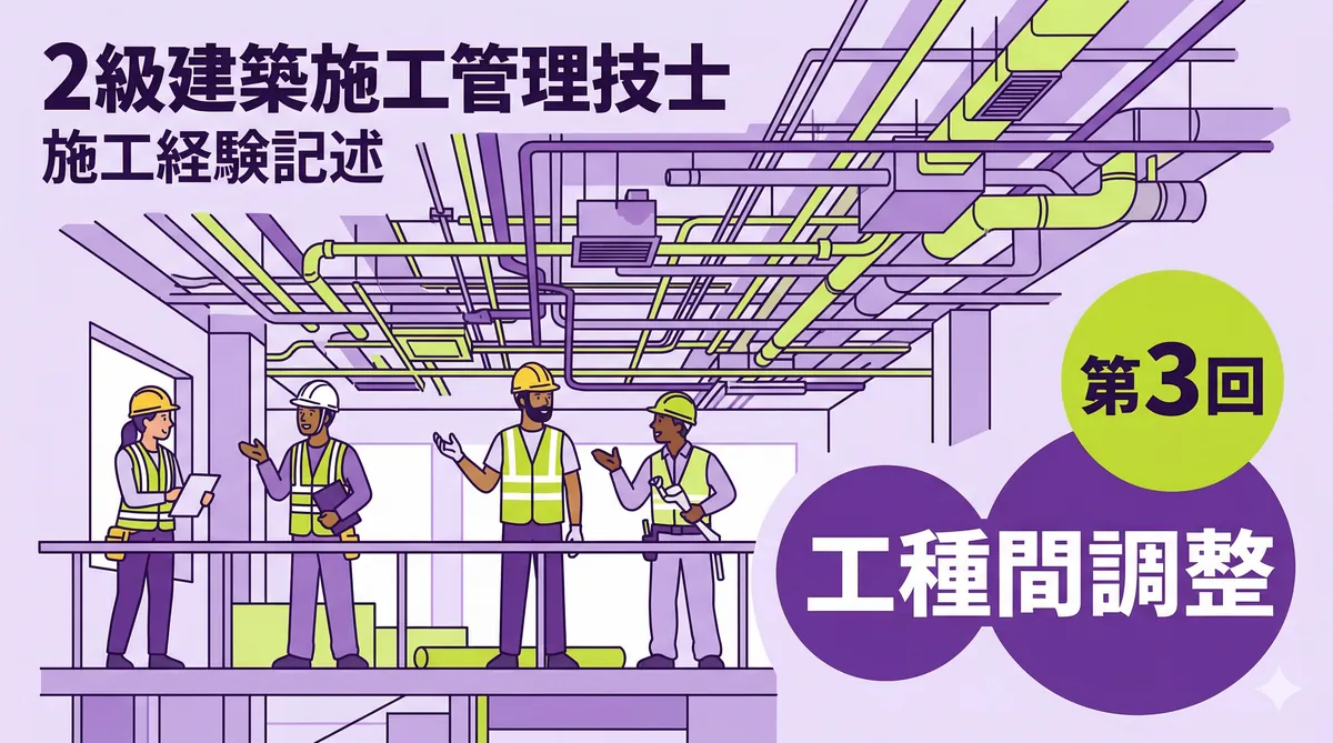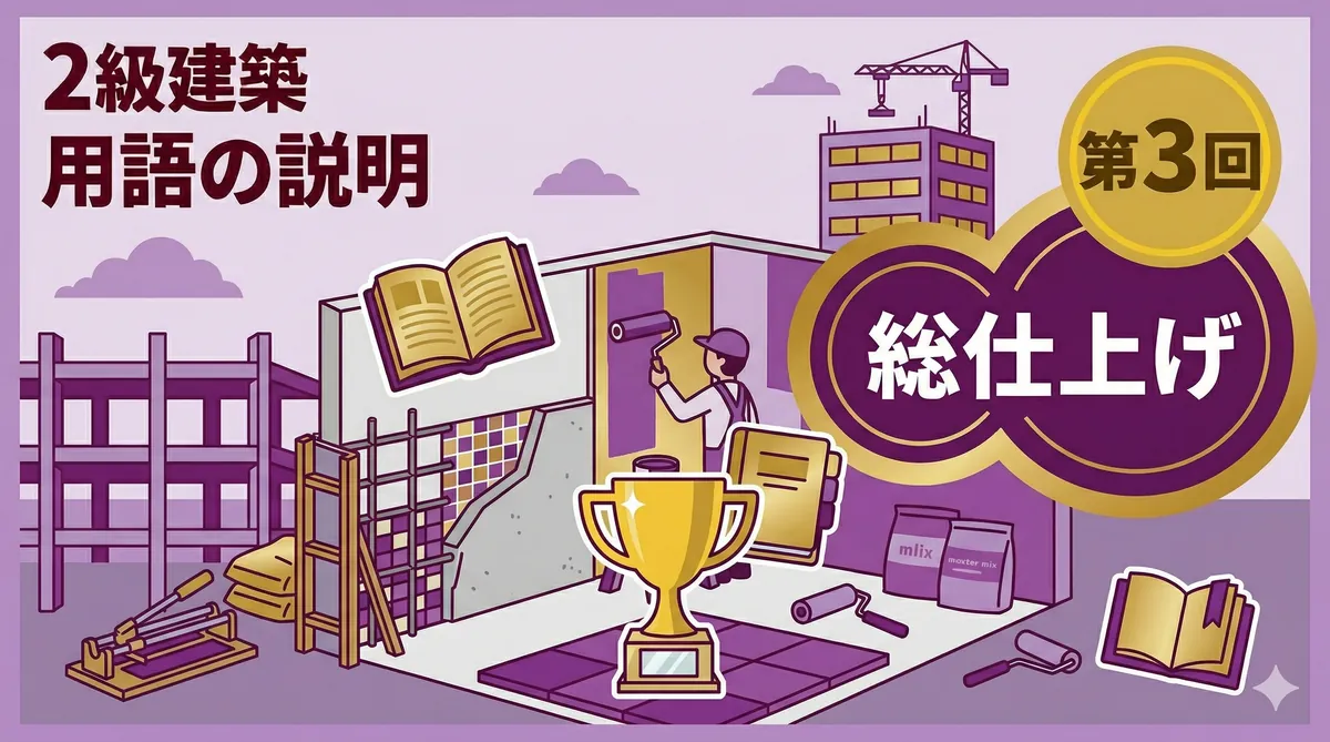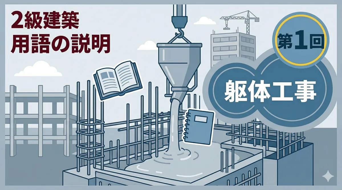 2級建築施工管理技士 用語の説明・留意事項ミニテスト 第3回 結論から言います。第3回は躯体工事と仕上げ工事の混合問題です。本番の試験でも両方から出題されるため、ジャンルを問わずに対応できる力が必要です。 第1回(躯体)、第2回(仕上げ)で練習した力を総合的に試す総仕上げ回です。「用語の説明・留意事項の対策」を参考にしてください。 テスト情報 形式:記述式(模範解答付き) 問題数:5問(躯体・仕上げ混合) 出題範囲:躯体工事+仕上げ工事(混合) 目標時間:20分 第3回のポイント — 躯体・仕上げ混合で総 ...