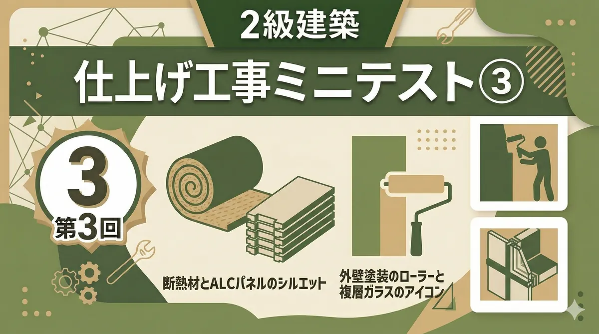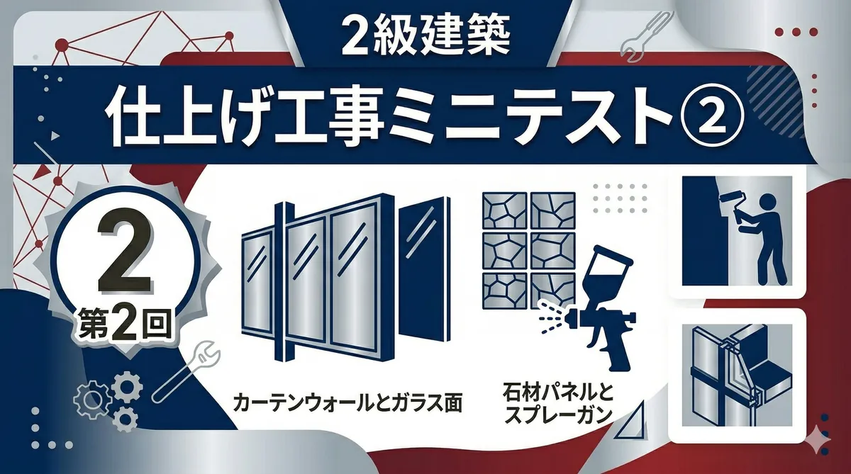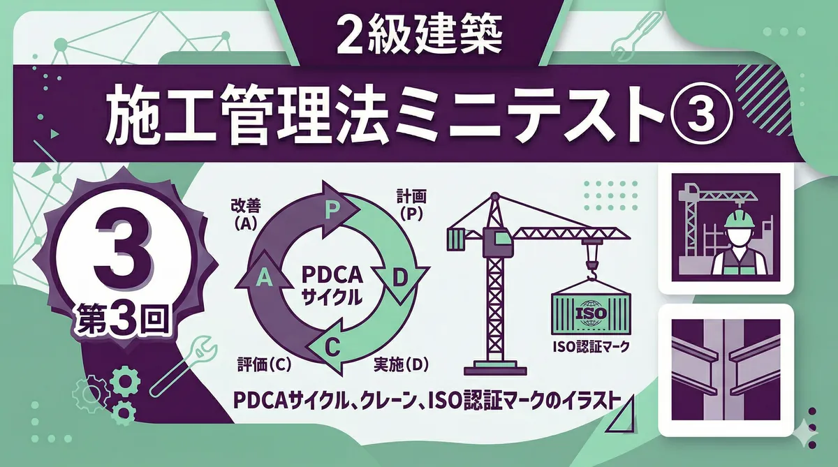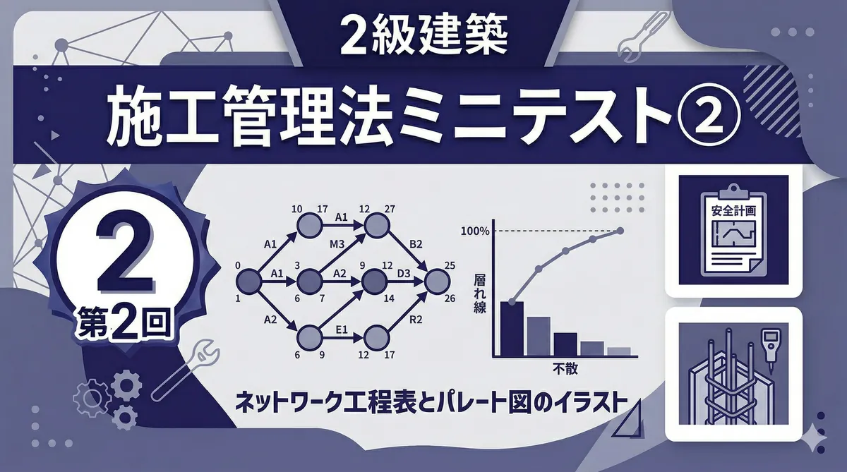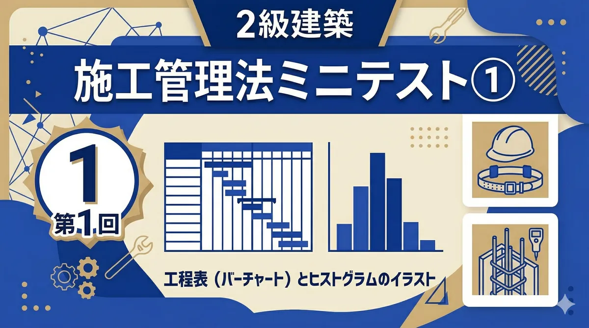 2級建築施工管理技士 施工経験記述(品質管理)ミニテスト 第2回 結論から言います。第2回は防水工事とタイル工事の品質管理がテーマです。どちらも「施工後に見えなくなる」部分の品質を確保する点が共通しています。 第1回のコンクリート工事に続き、仕上げ工事における品質管理の記述力を鍛えましょう。「施工経験記述の書き方(品質管理)例文・採点ポイント」の内容を実践する練習です。 テスト情報 形式:記述式(模範解答付き) 問題数:3問(テーマ選択+課題・対策・結果の記述練習) テーマ:防水工事またはタイル工事の品質 ...